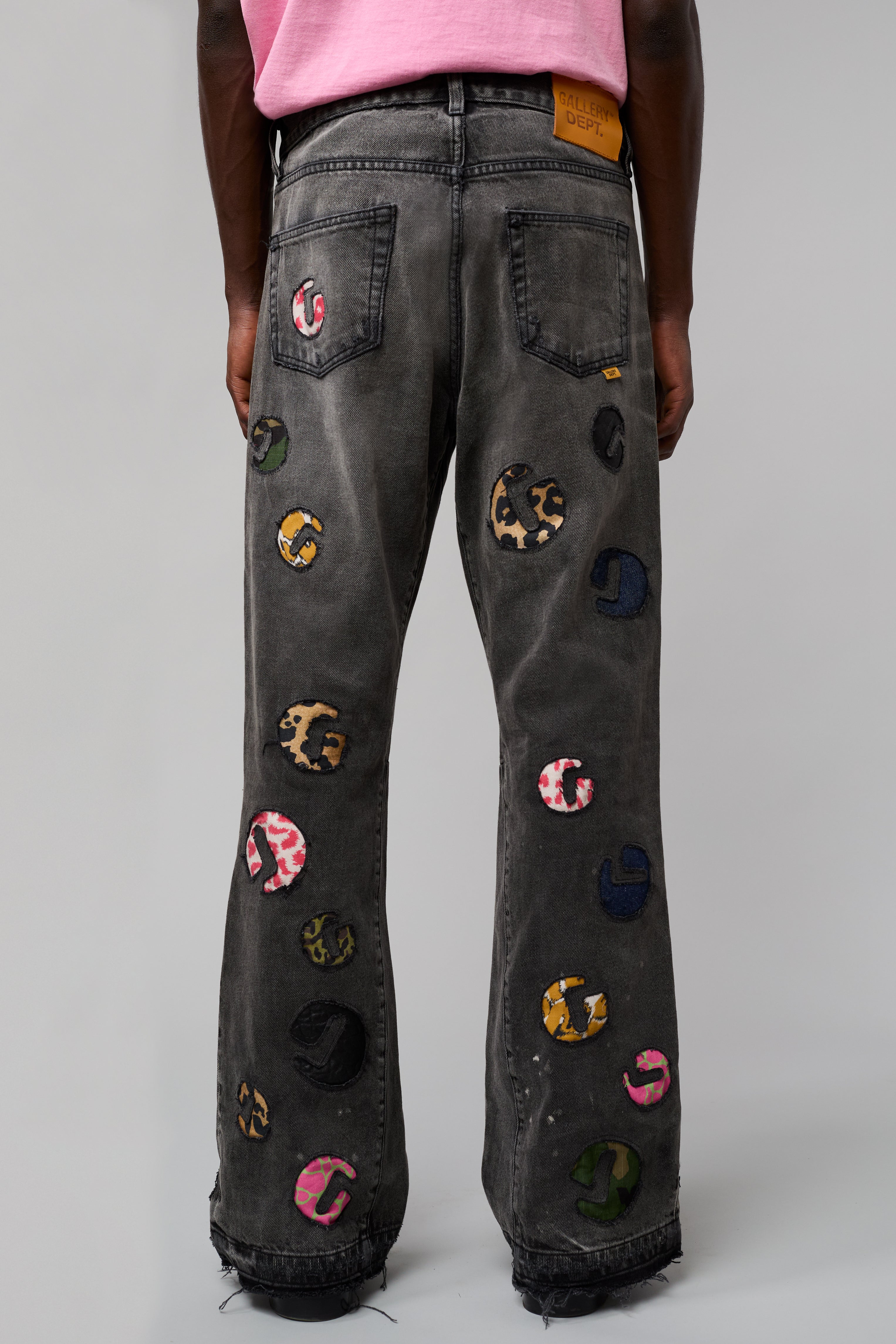 - Debossed tan leather GALLERY DEPT. jacron on the back waistband.