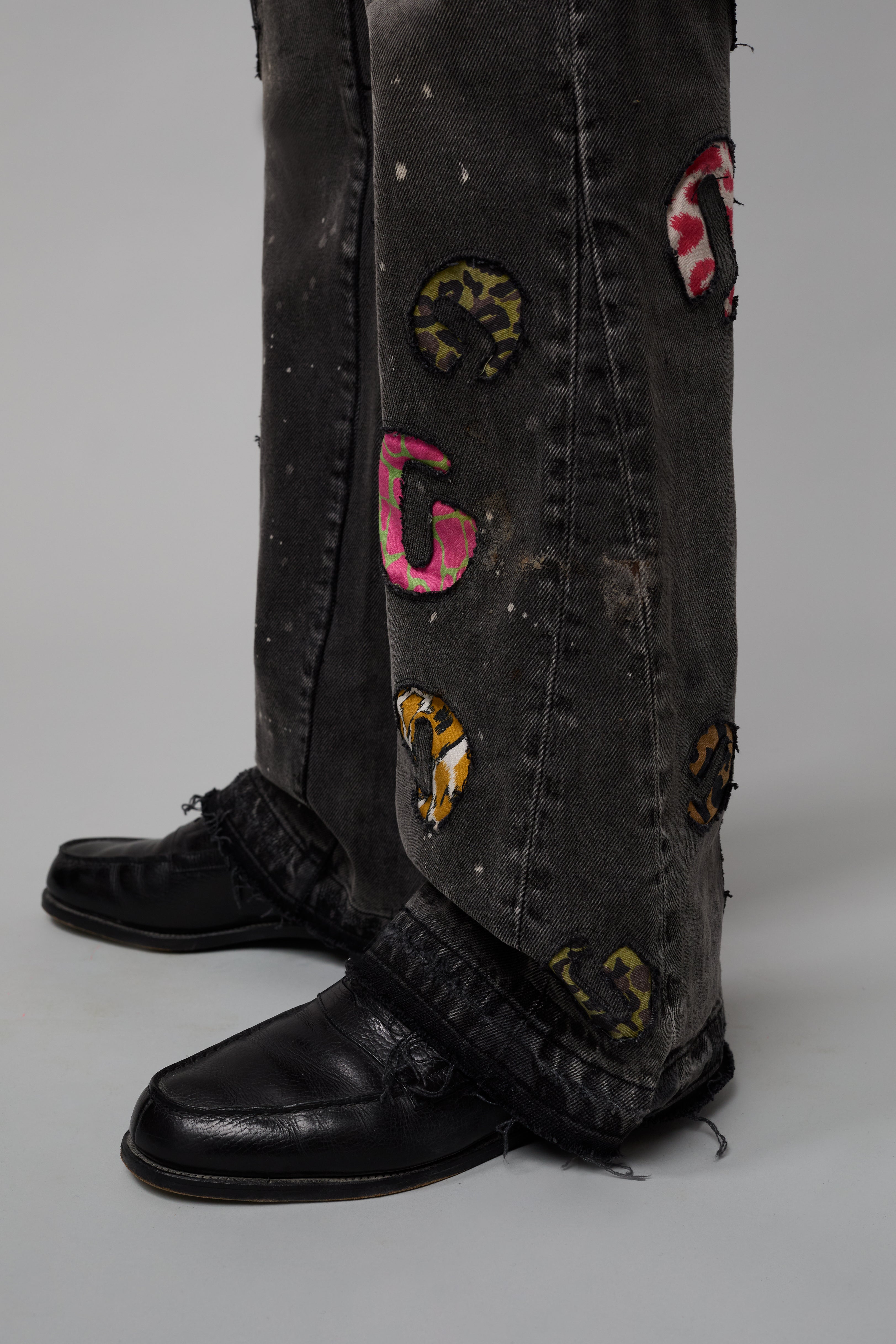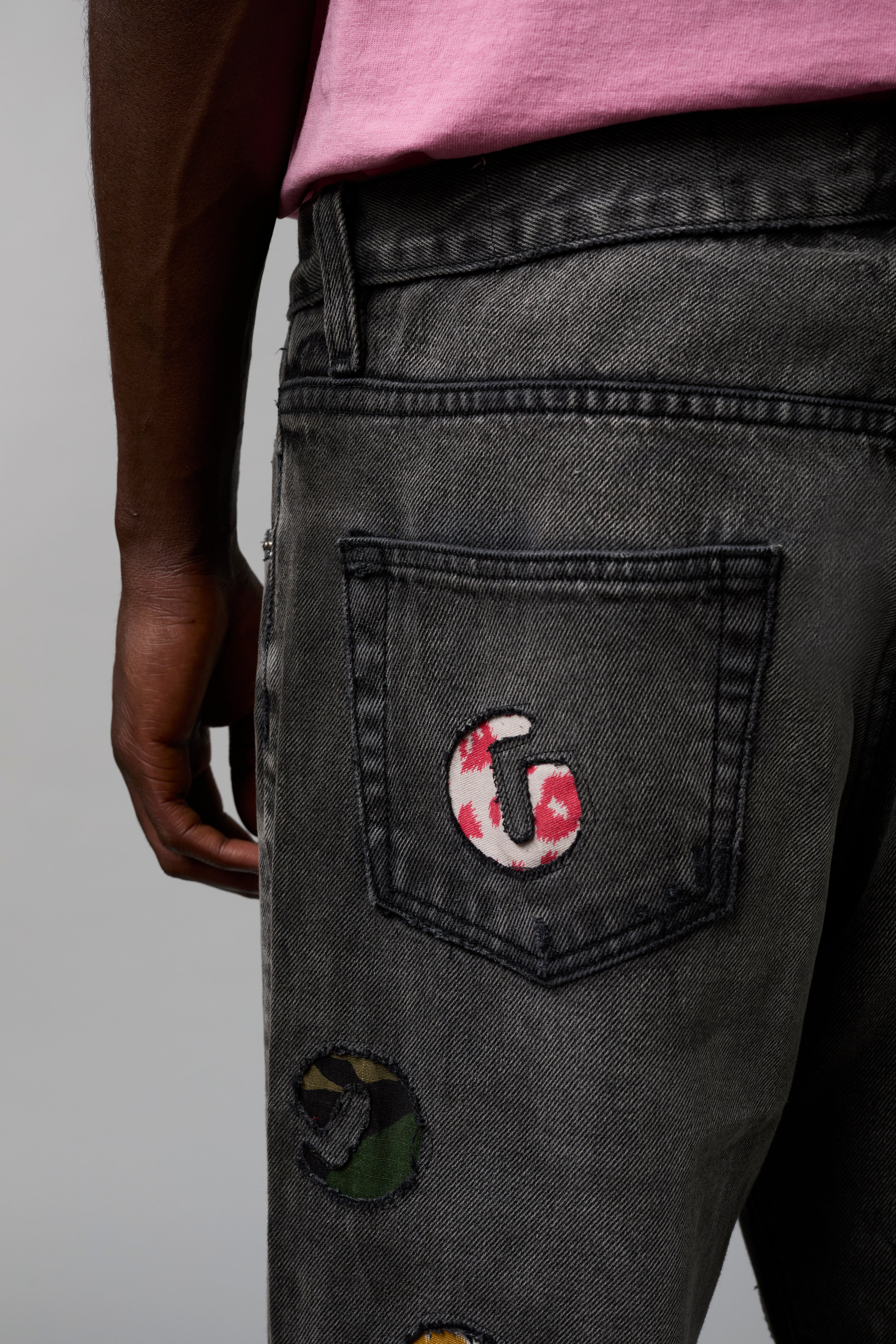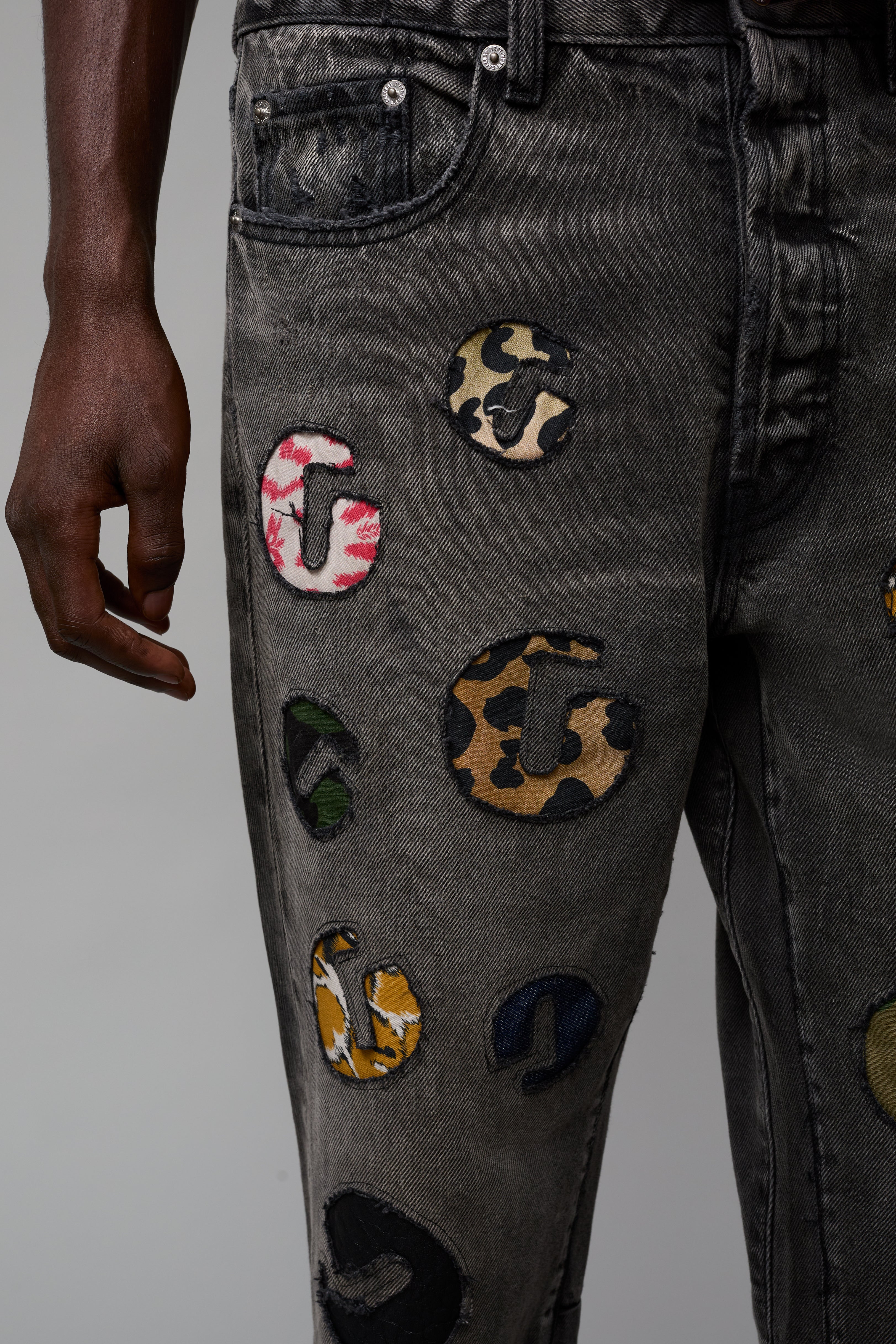 - Adorned with assorted denim and leather G-patches.