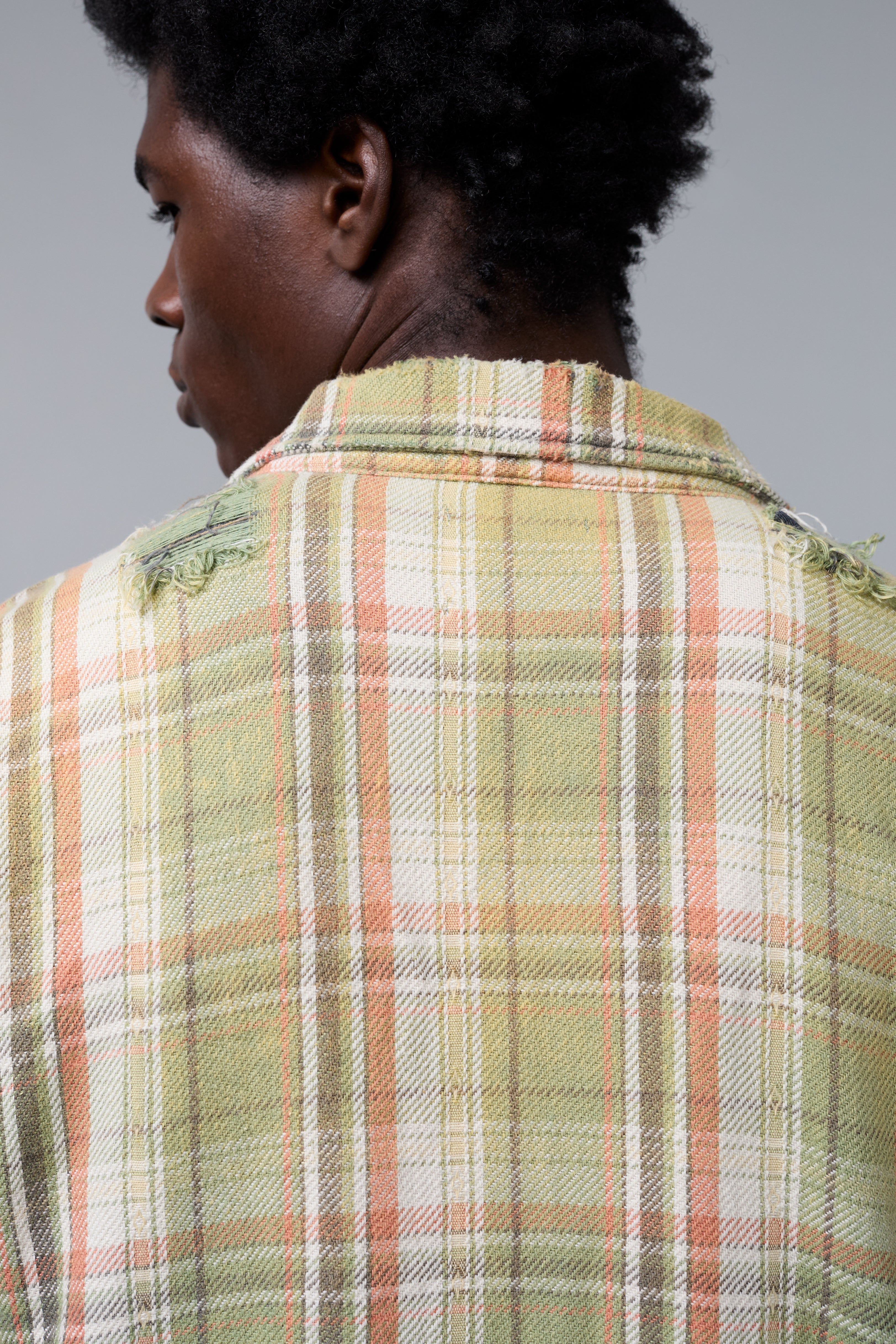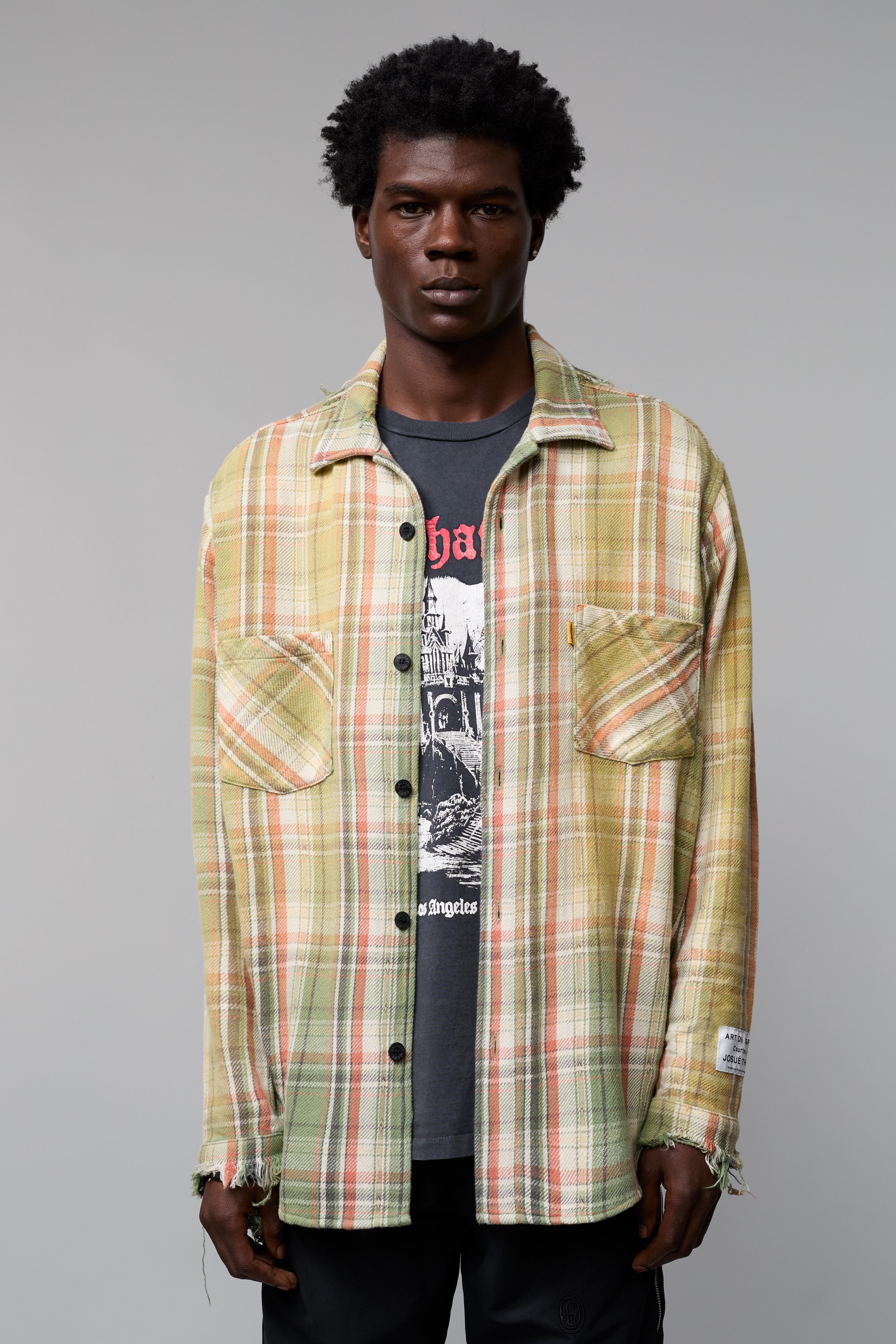 - Button-down flannel with two pockets on each side of the front chest.