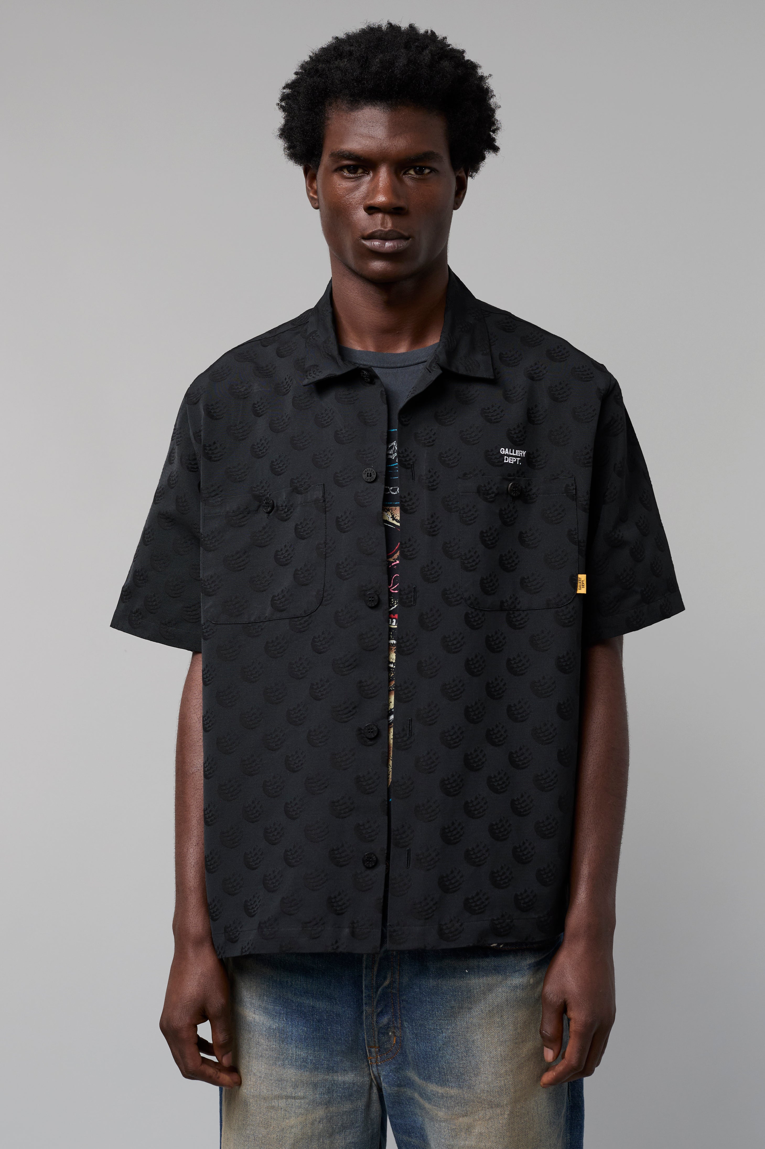 - Features a camp collar and buttoned front pockets.