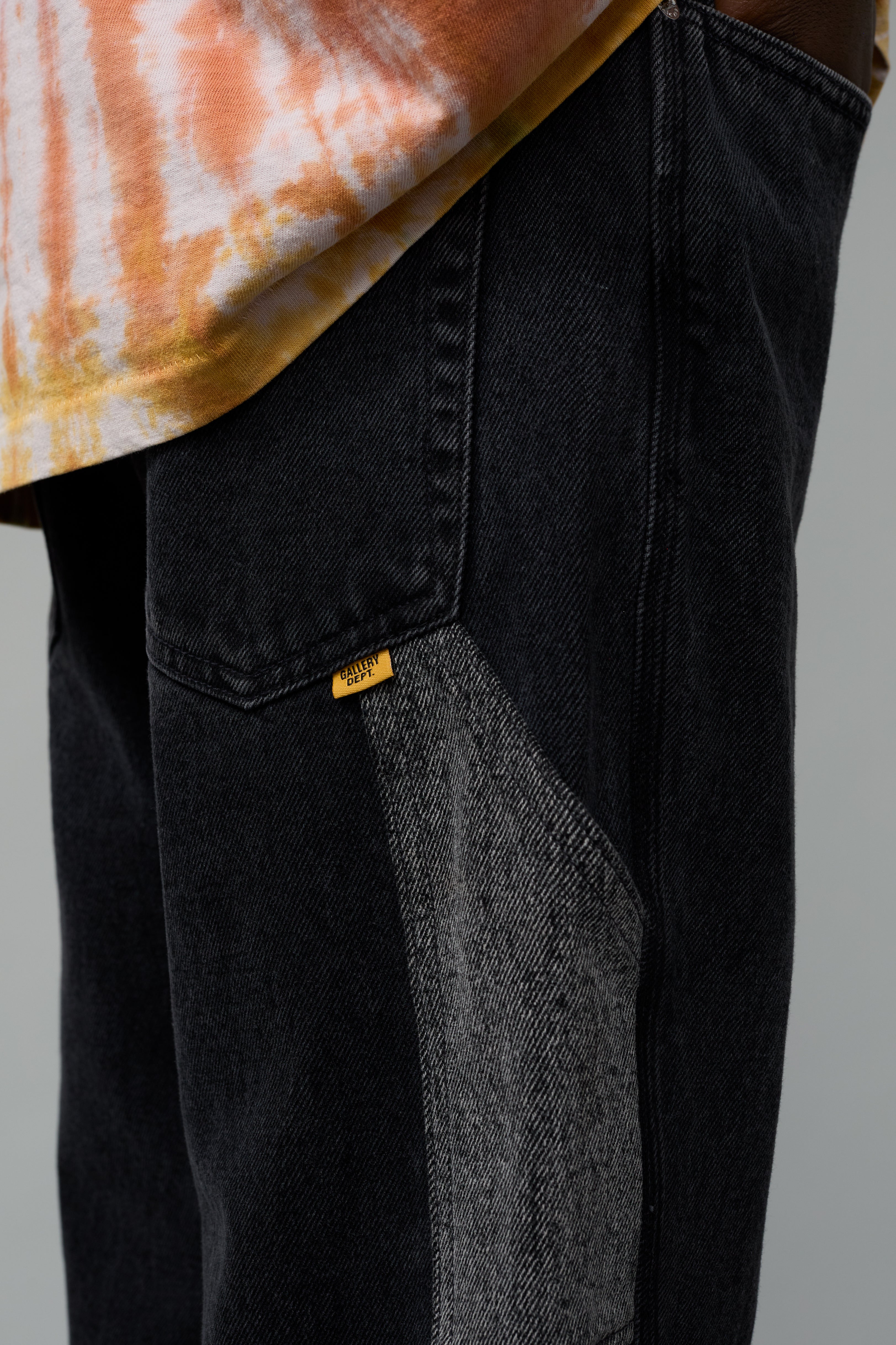 - Debossed tan leather GALLERY DEPT. jacron on the back waistband.