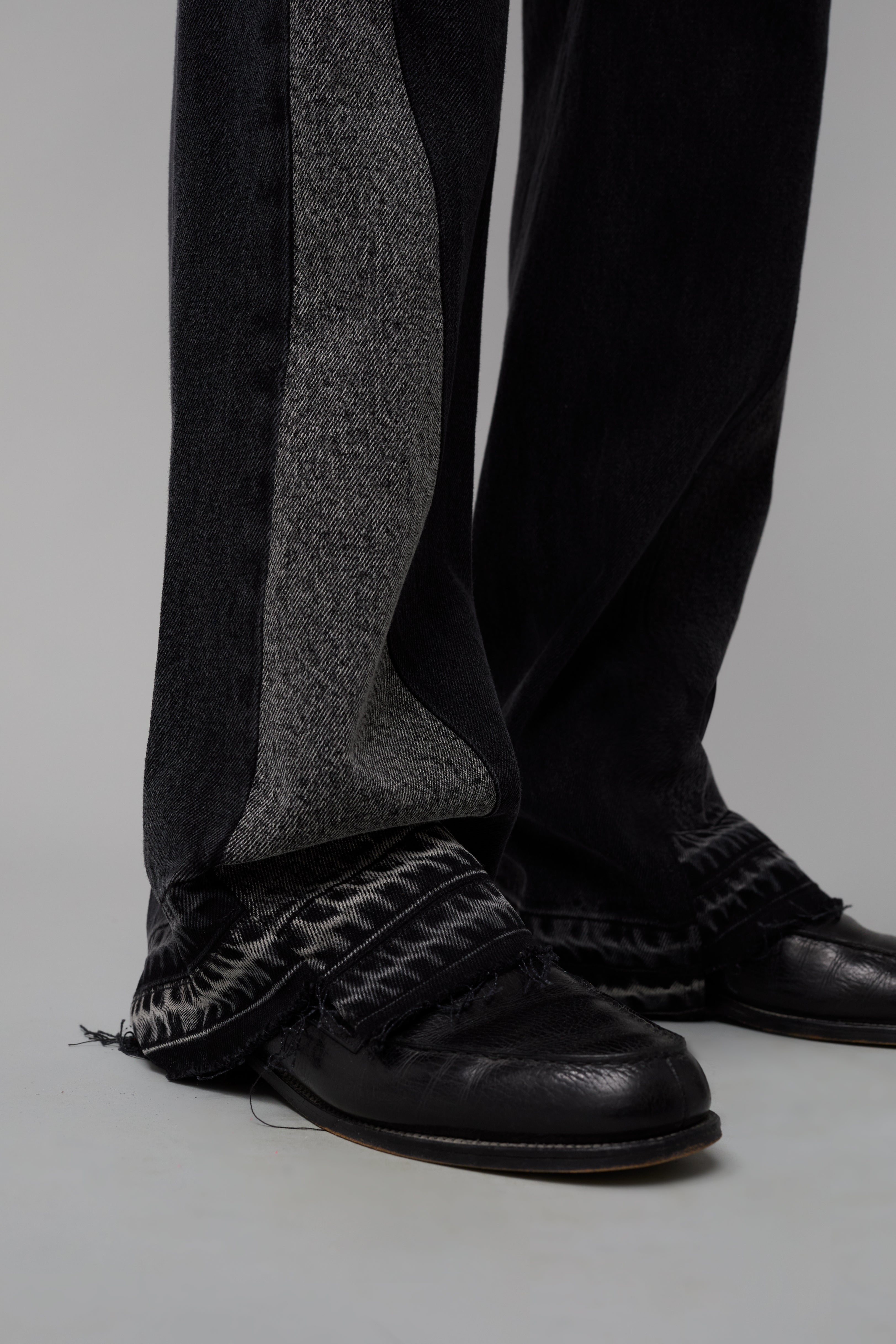 - Uneven cut released hem, constructed with tonal paneling along the legs.
