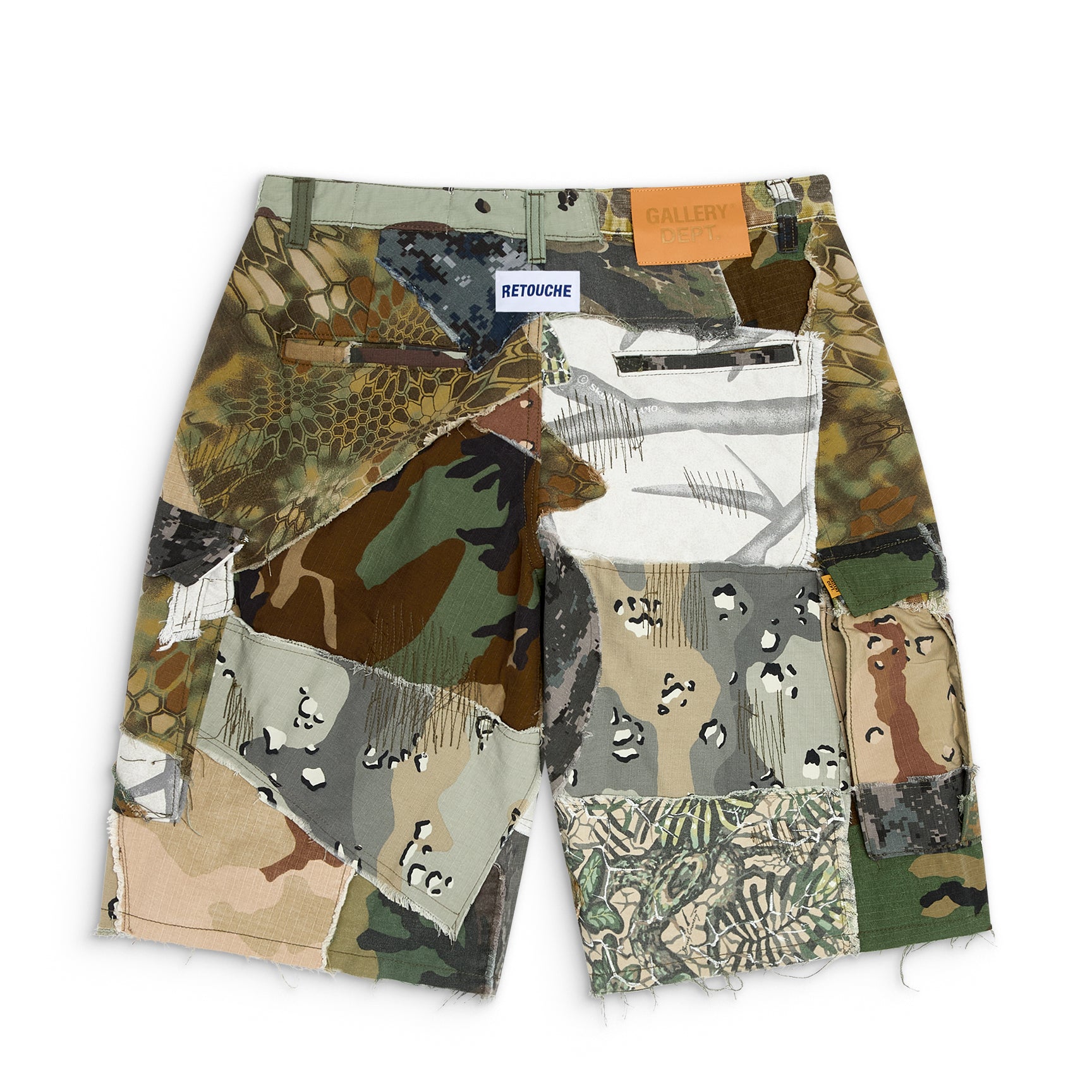 Camo patchwork cargo shorts made from vintage blankets, finished with utility-style pockets, GD custom hardware, a debossed tan leather GALLERY DEPT. jacron at the back waistband, and a raw hem.