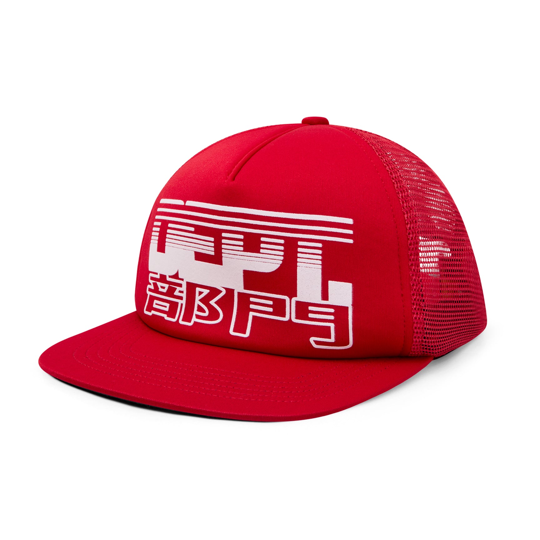 Classic 6-panel trucker hat with a curved bill and adjustable snap closure. Features our TOKYO DEPT. logotype printed on the front. Features our patent wash process that uses unique fading techniques for each piece, inclusive of logos and graphics.
