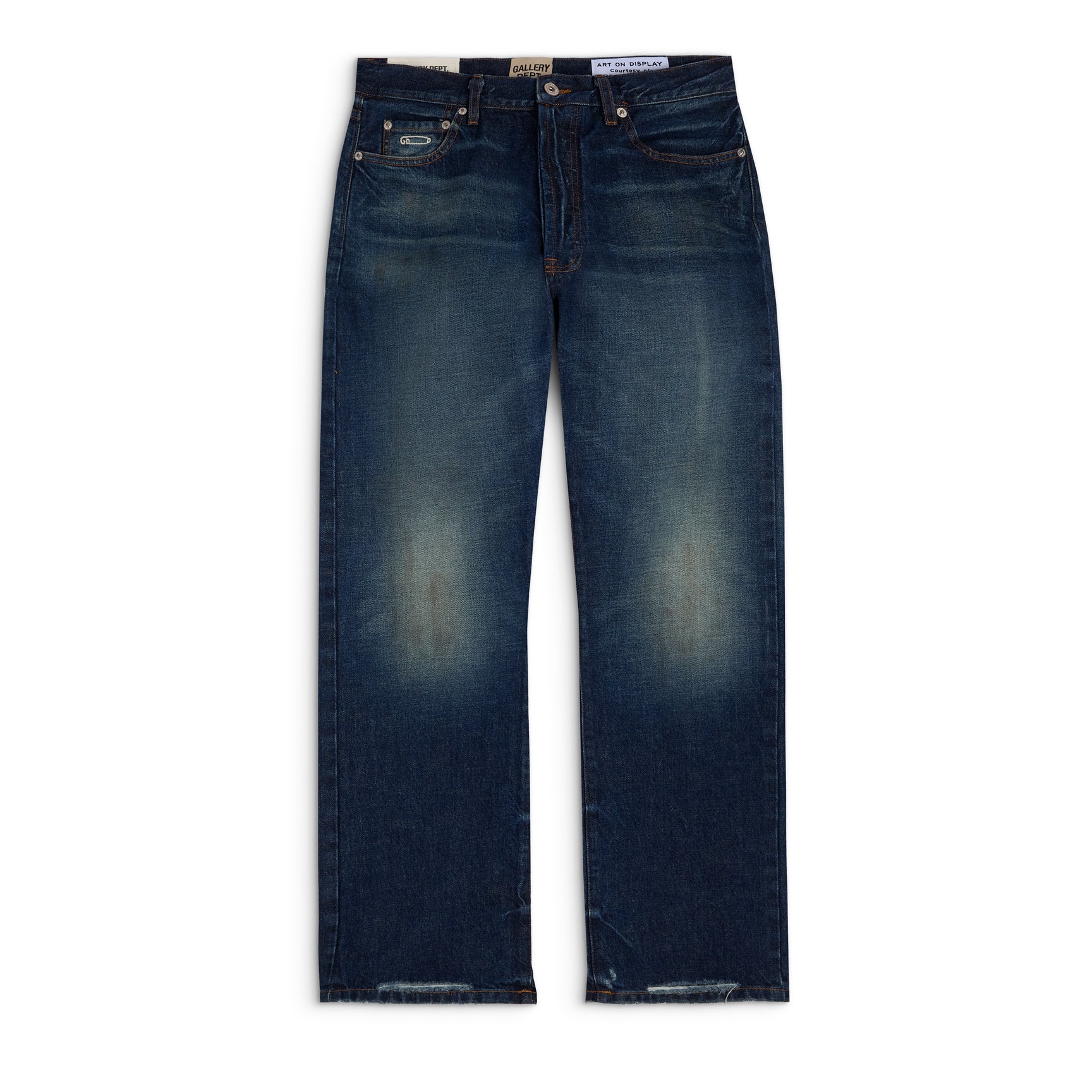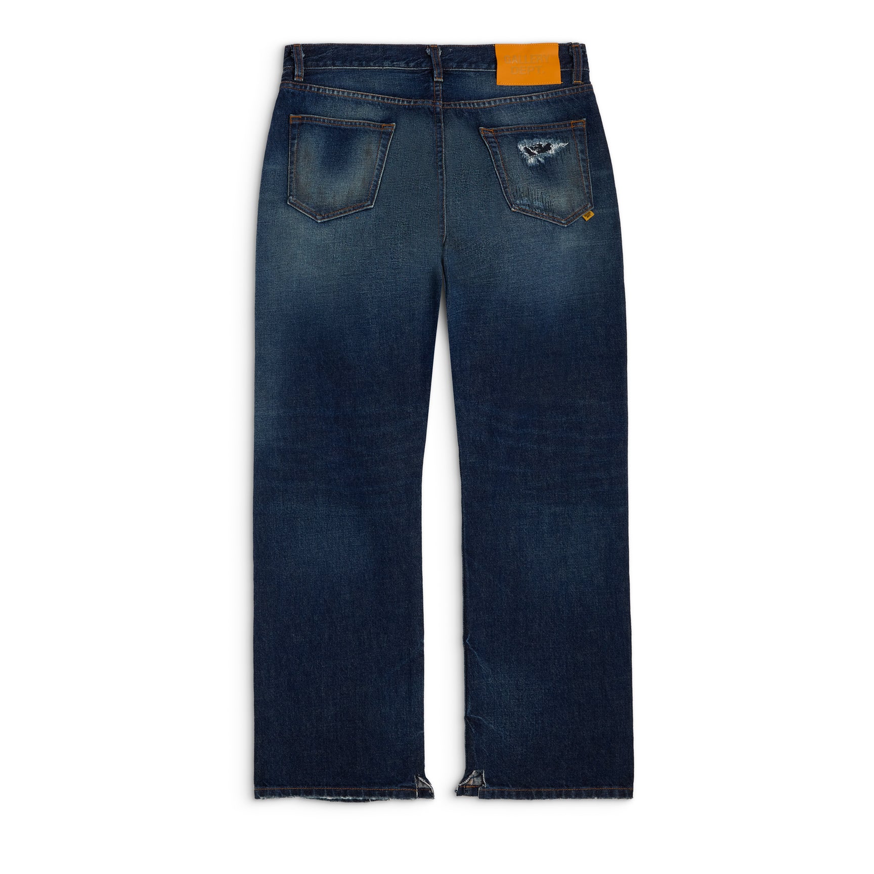 - Debossed tan leather GALLERY DEPT. jacron on the back waistband.
