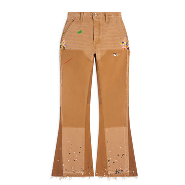- Slim fit silhouette with gradual flare and wide leg opening, finished with a raw hem.