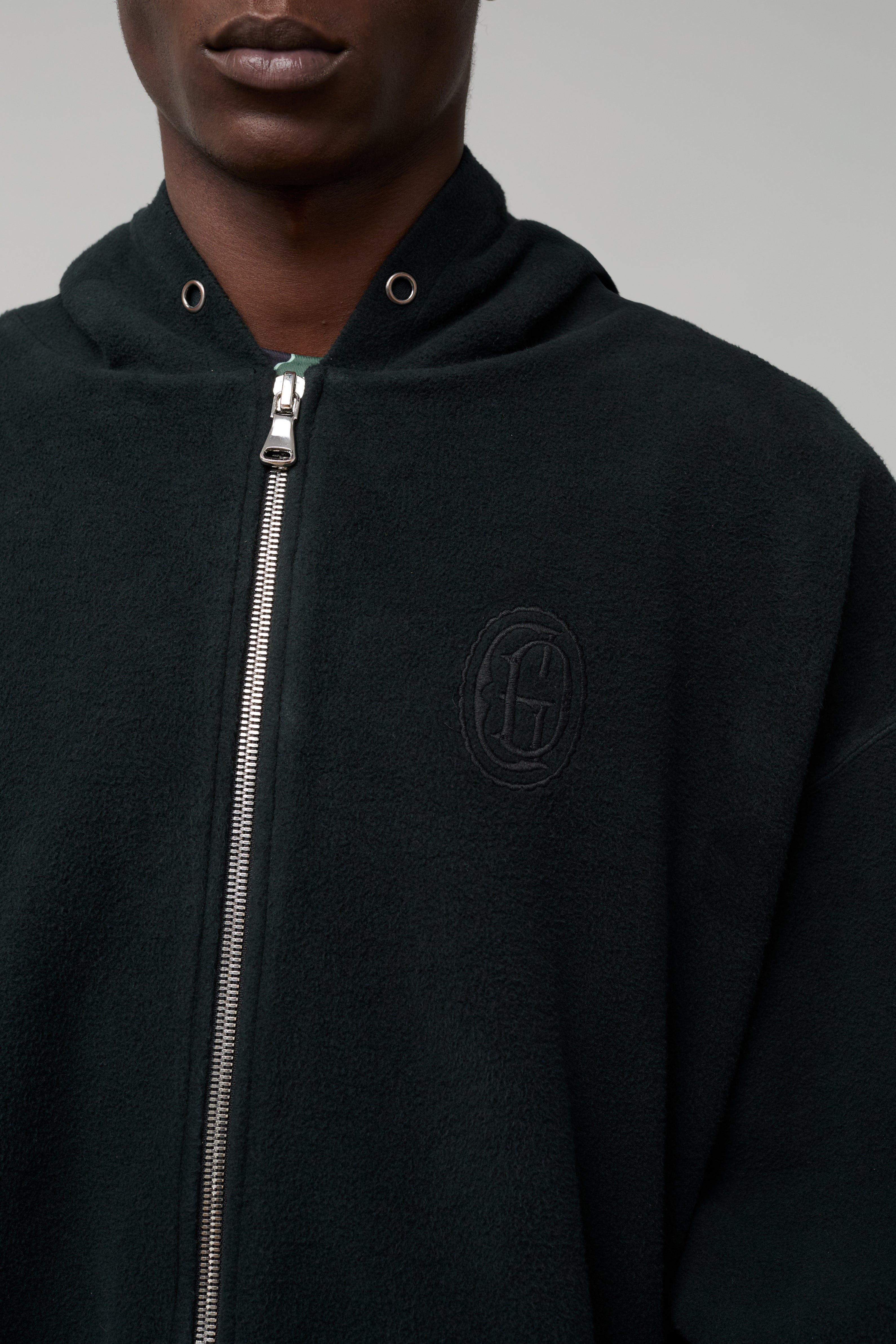 - Long sleeve zip-up hoodie.