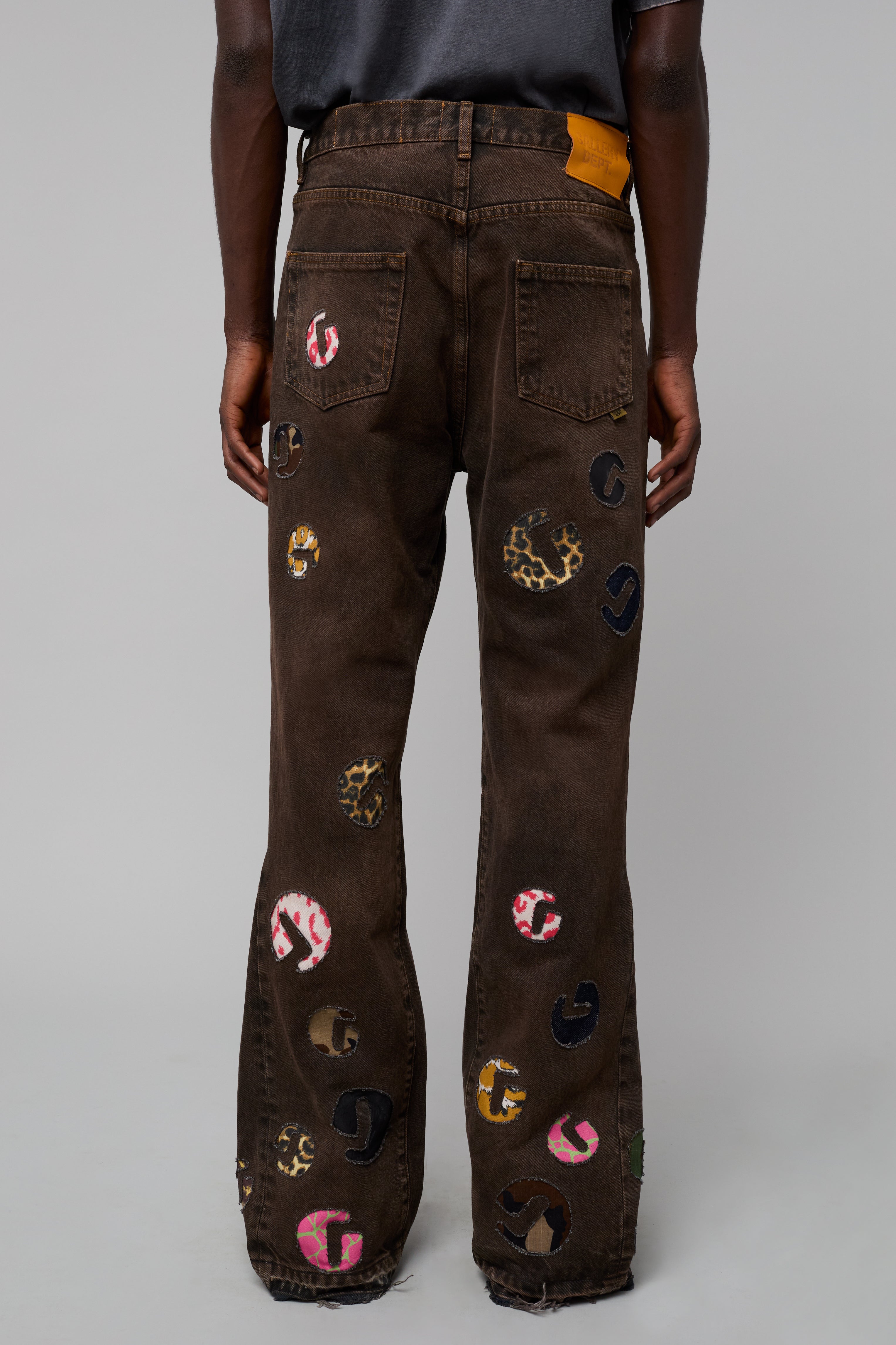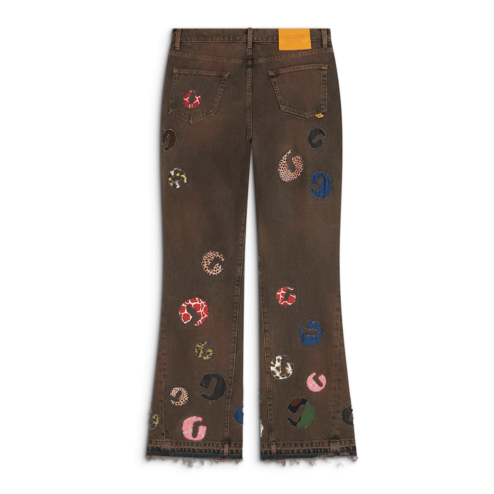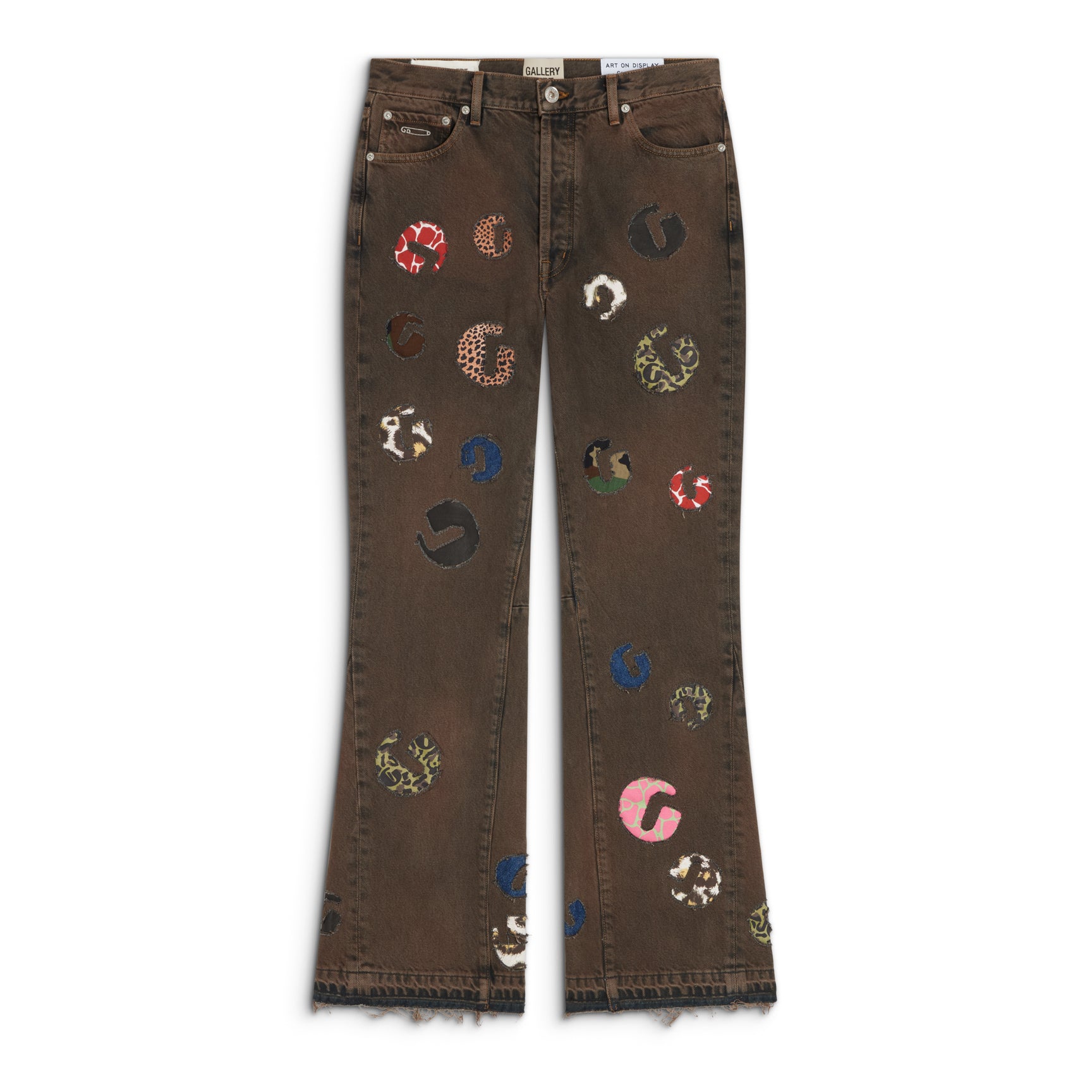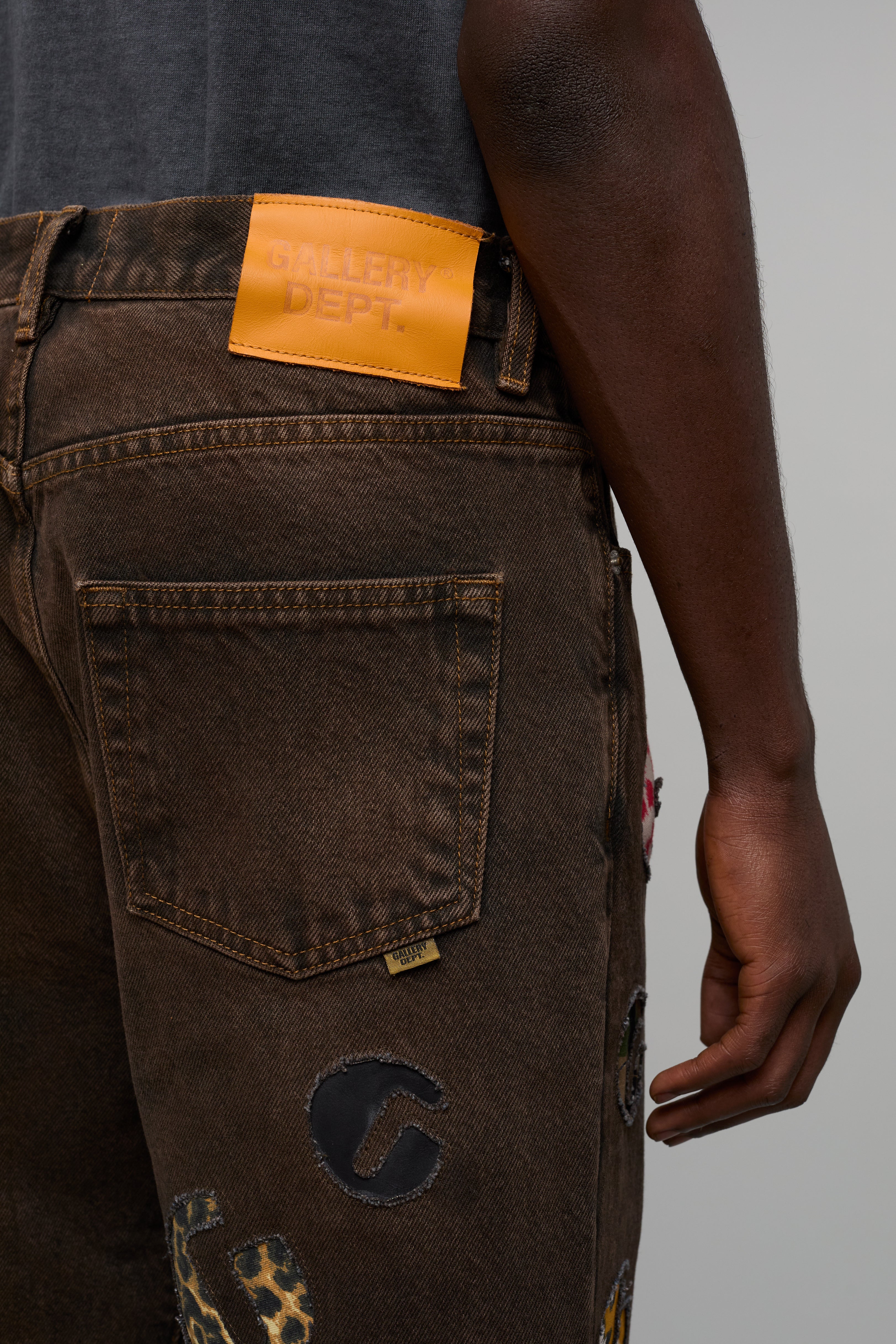 - Debossed tan leather GALLERY DEPT. jacron on the back waistband.