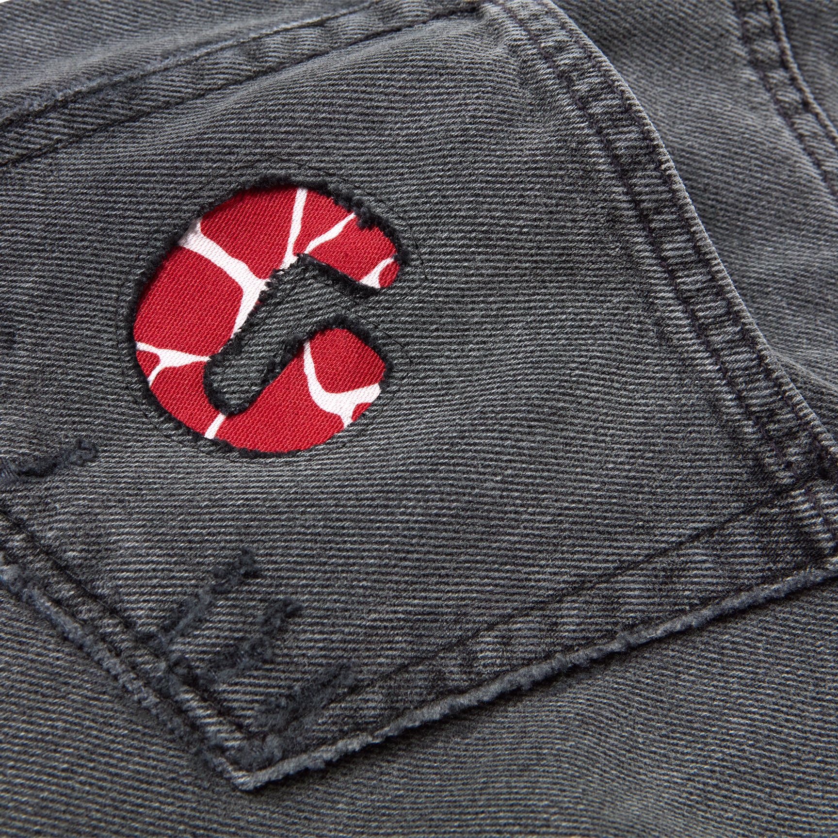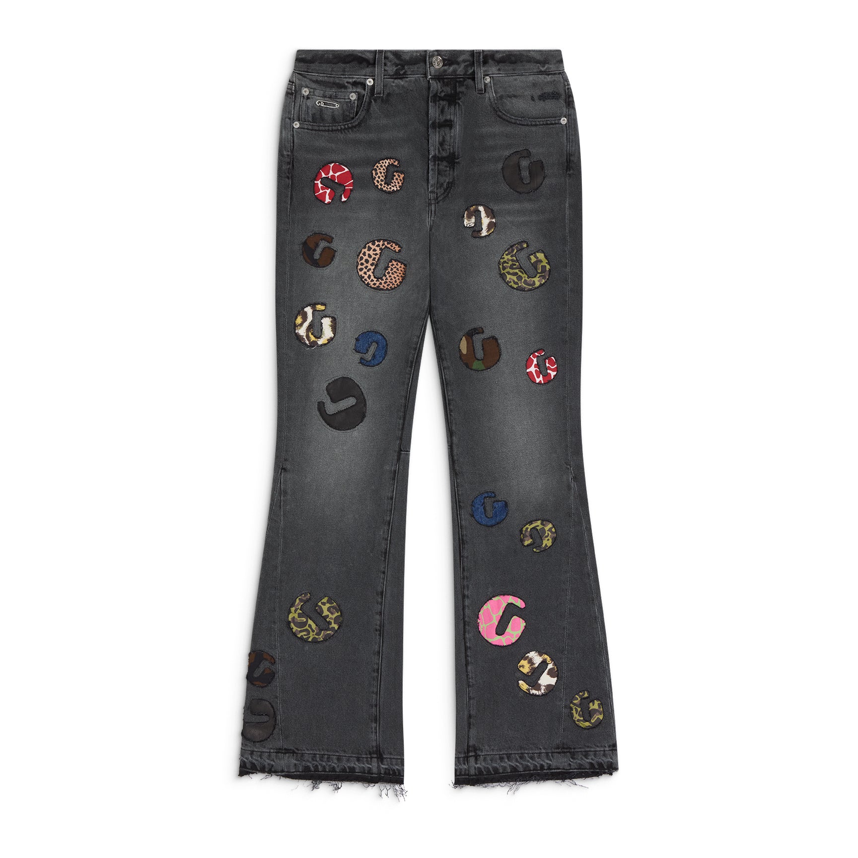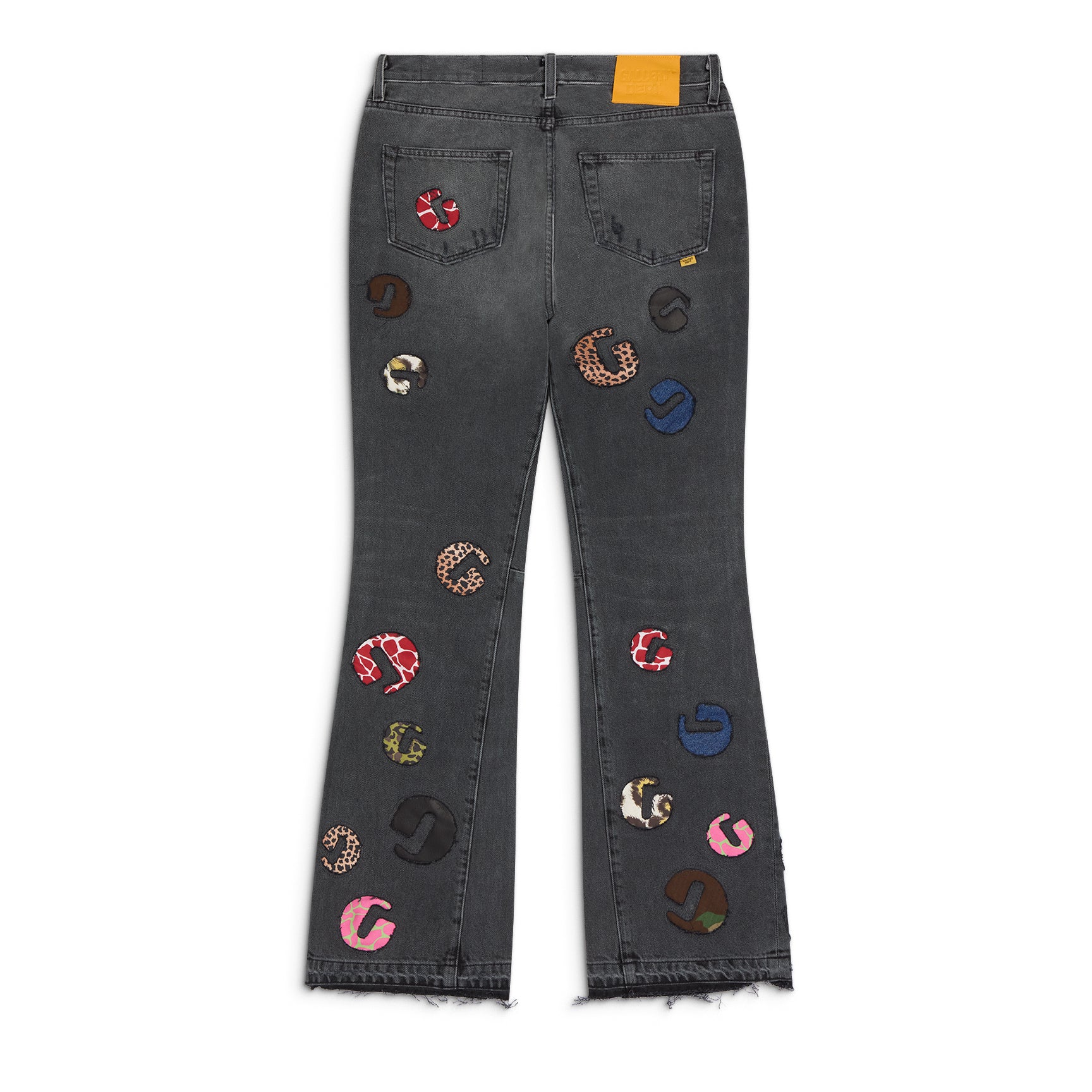 Slim fit with wide leg opening and 5-pocket design. Each pair is distressed, reinforced, repaired, and hand-painted with custom GD hardware.